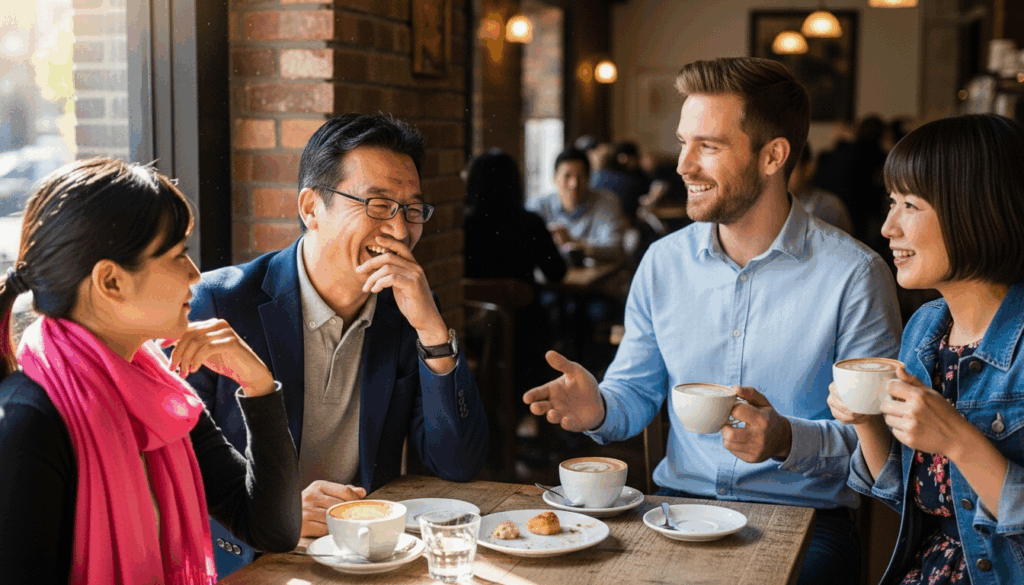 ジェイムズ英会話新潟校の講師や他の参加者と一緒に、リラックスした雰囲気の中で英語を使いながら楽しくおしゃべりしましょう。英語のレベルは問いません。初心者の方も大歓迎です!